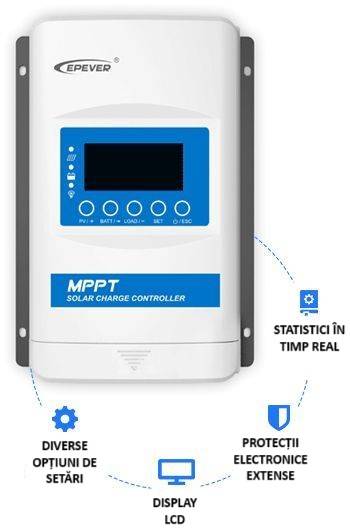 Regulatorul solar este echipat cu cea mai recentă tehnologie MPPT (Maximum Power Point Tracking) - urmărirea punctului de putere maximă cu un algoritm îmbunătățit, prin care modulul solar funcționează la tensiunea optimă. Comparativ cu regulatorul clasic PWM, tehnologia MPPT crește eficiența încărcării cu aproximativ 30%.