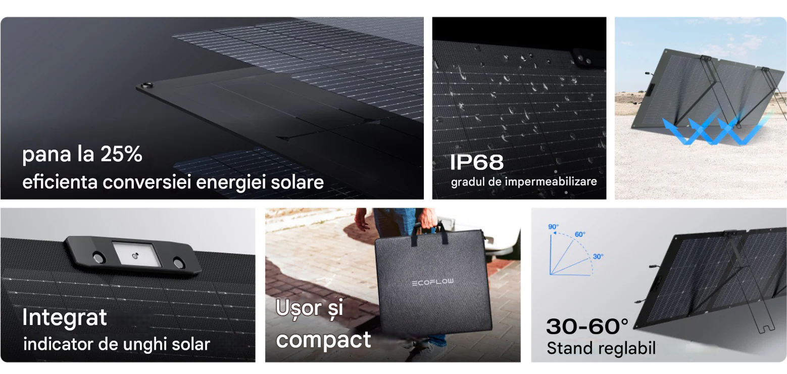 Panoul solar pliabil EcoFlow 160W din a doua generație aduce o eficiență mai mare a celulelor solare comparativ cu generația anterioară și posibilitatea de a obține mai multă energie din lumina soarelui datorită indicatorului încorporat al unghiului soarelui și suportului integrat care permite înclinarea panoului în funcție de poziția curentă a soarelui.