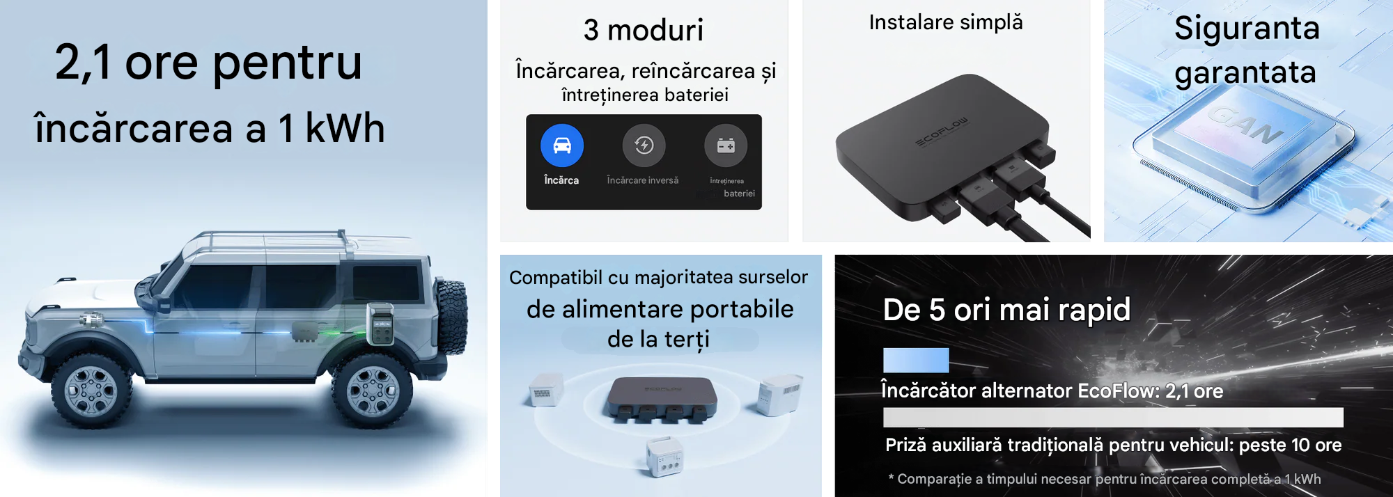 La bază se află tehnologia avansată GaN (nitrură de galiu), care asigură o eficiență excepțional de ridicată a transferului de energie. Acesta include în mod natural un set complet de protecții, inclusiv protecție împotriva polarității inverse, supratensiunii, subtensiunii, supracurentului și scurtcircuitului.